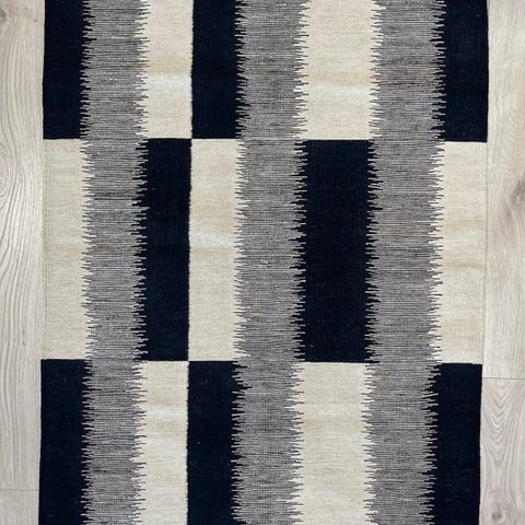 Moderne kilim fra Afghanistan i sorte, hvide og grønne nuancer.