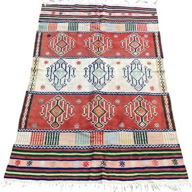 Dette er et fantastisk tyrkisk Usak-kilim lavet i 1940'erne til 1950'erne, et meget levende tilskud til dit hjem fra hjertet af Anatolien. Kilims blev ikke kun brugt som praktiske stykker, men også som talismaner for held, frugtbarhed og velstand i Anatolien i tusind år. Du kan få en del af denne unikke historie til dit hjem!