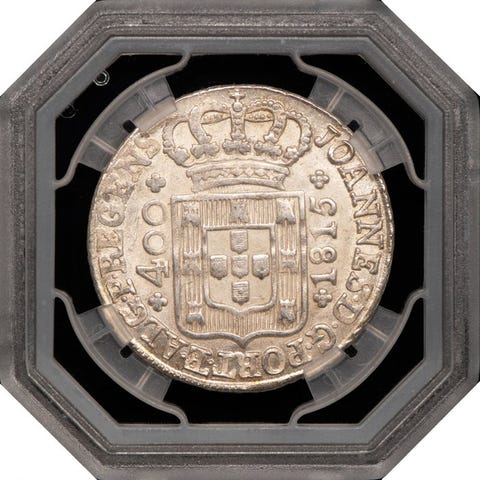 Portugal sølv Cruzado Novo (480 Reis) mønt fra 1816, bedømt GENI MS63 af D. João Príncipe Regente, vægt 15,11 g, diameter 35,75 mm. Klik på den blå "gå til varen" knap, for at købe eller byde på denne vare. Den samlede pris vil blive vist inden du afgiver dit bud.