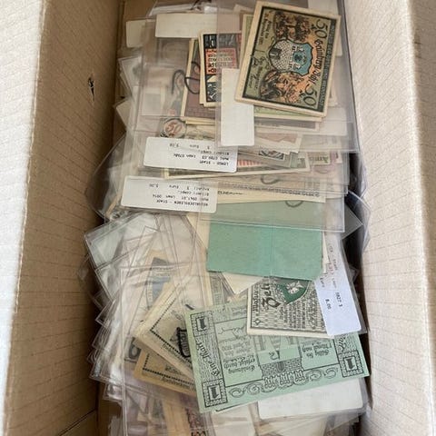 Megalot på 785 østrigske Notgeld sedler fra 1920'erne, ikke længere legal betalingsmiddel, delvist løse sedler og delvis komplette serier, i varierende kvaliteter med nogle UNC og mindre skader. Klik på den blå "gå til varen" knap, for at købe eller byde på denne vare. Den samlede pris vil blive vist inden du afgiver dit bud.