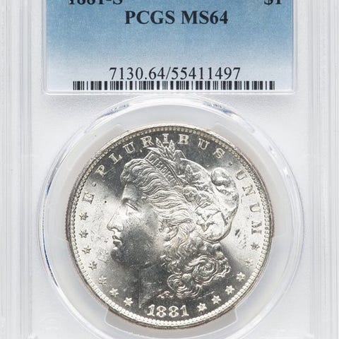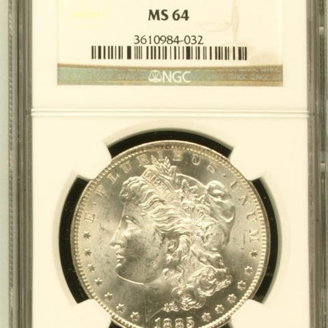 Mønt af typen "Morgan Dollar" støbt i møntværket New Orleans, kendetegnet ved mærket "O". På forsiden viser billedet af frihedens personifikation, designet af George T. Morgan. På bagsiden findes ørnen iført et sæt og holder en olivengren og en bunt pile. Det er en af de mest ikoniske mønter i amerikansk numismatik i det 19. århundrede.
