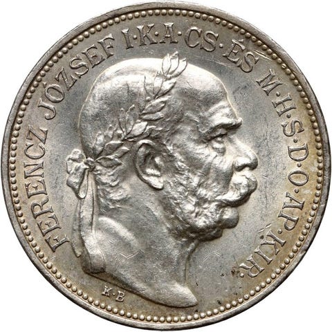 Mønt i erindringsøjemed af 1 Corona udstedt til 60-års jubilæet for Franz Josef I’s regeringstid, og som på forsiden viser kejserens nøgne portræt mod højre, i en nøgtern og realistisk stil, med detaljeret modellering af skæg og hår. Bagsiden viser den strålende kejserlige krone over monogrammet FJI mellem laurbærris, ledsaget af årene 1848–1908 og værdien 1 Corona. Reliefet fremstår veldefineret, med original