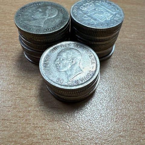 Interessant lot på 105 sølvmønter af 1 peseta i sølv. Forskellige årgange.
