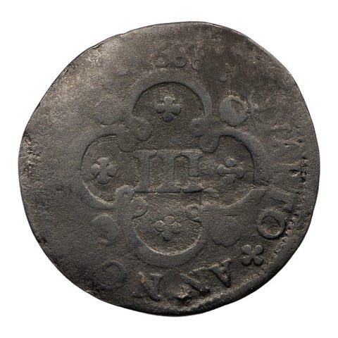 Portugal sølvmønt 250 Reis (Coroado sobre Meio Cruzado) fra D. João IVs Lisboa-udgave med Cruz Cercada, Cordão og Cunho Orla Nova; vægt 11,00 g, diameter 32,55 mm, Alberto Gomes-katalog 101.02, fra D. Pedro II (1683-1706). Klik på den blå "gå til varen" knap, for at købe eller byde på denne vare. Den samlede pris vil blive vist inden du afgiver dit bud.