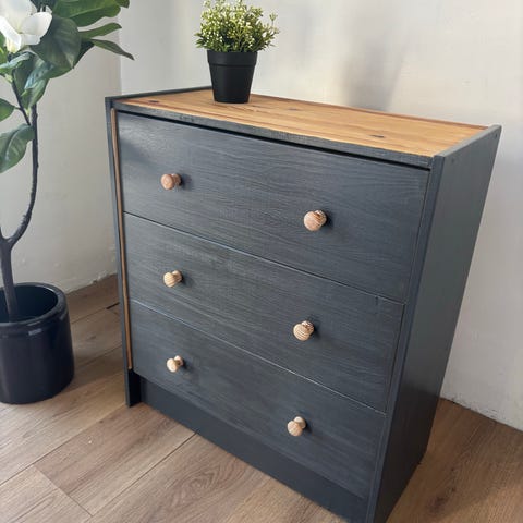 Nyrestaureret sengebord/kommode, den er blevet slebet, malet med kalkmaling i farven Black velvet og tilsidst behandlet med voks.