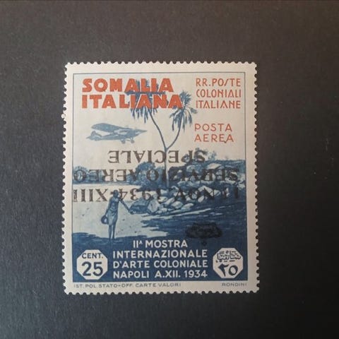 Italienes Kongerige, Statens Tjeneste. Flyvning Roma–Mogadísio, 10 L. ardesia, gummiet intakt, luftpost-frimærke fra 1934, Sassone 2, med certifikat og ekspertunderskrift. Klik på den blå "gå til varen" knap, for at købe eller byde på denne vare. Den samlede pris vil blive vist inden du afgiver dit bud.