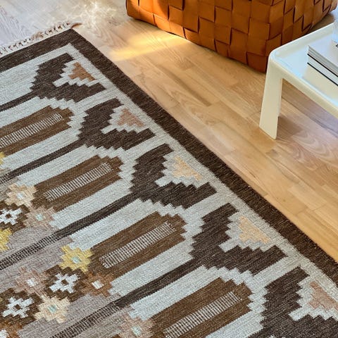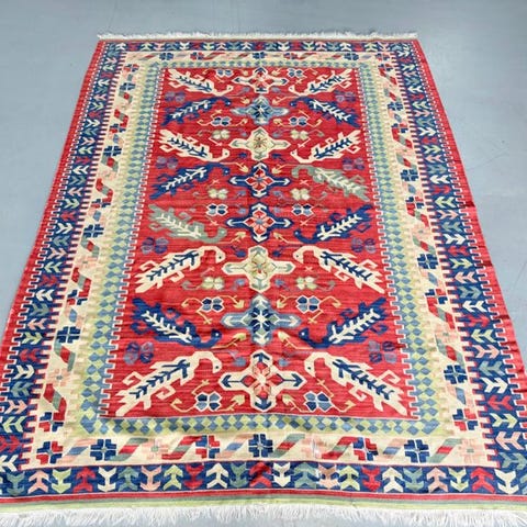 Håndvævet tæppe fra Afghanistan, fremstillet med den teknik, der kaldes Sumak. Det er tæpper med et tidløst design. Farverne blander nuancer af orange, blå, beige og grøn på en sublim måde, der skaber en harmoni både i design og i farverne, som er uforlignelig.