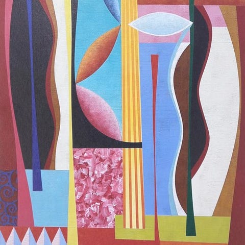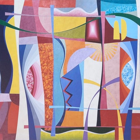 Beskrivelse : Abstrakt værk med geometriske og organiske former, med klare farver og markante kontraster.