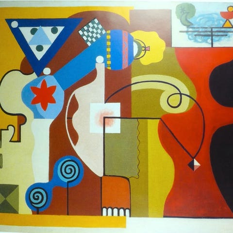 Beskrivelse : Komposition i klare farver med abstrakte og organiske former på en flerfarvet baggrund.