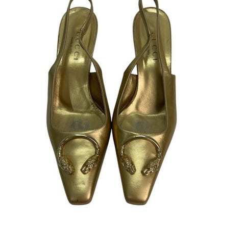 Disse luksus-sandaler fremstillet i Italien har en platformhæl på 3 tommer (75 mm) og kendes ved mærkets ikoniske Horsebit-udstyr i gylden tone foran.
