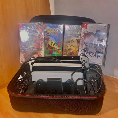 Jeg sælger denne fantastiske hvide Nintendo Switch OLED. Den leveres komplet med alle kablerne, i originalemballagen, holdt ekstremt omhyggeligt. Der er også en rejsetaske.