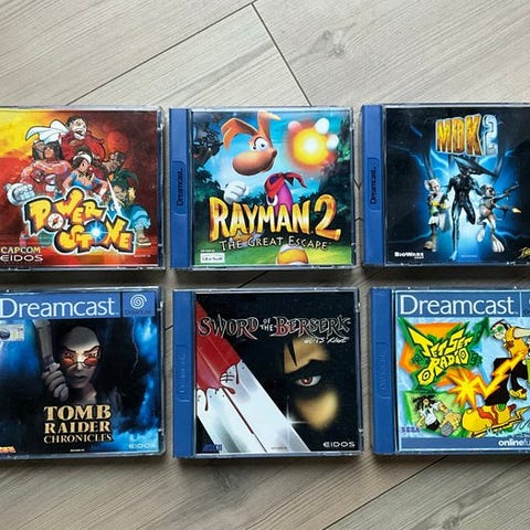 Omhyggeligt udvalgt samling af 6 originale titler til SEGA Dreamcast, alle i europæisk PAL-version, komplette med manualer og blå originale covers.