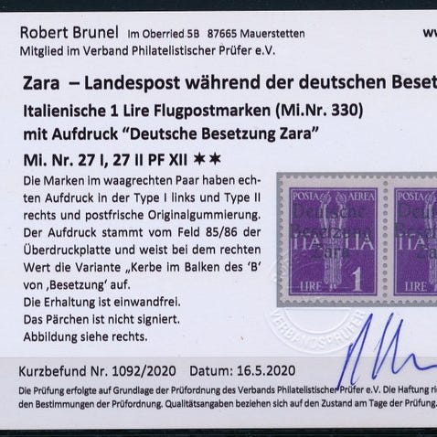 Tyskriget – Besættelse af Zara; flyvetegn 2 Lire med tryk, sjælden pladefejl i felt 21, oplag 93 stk.; MNH med origingummi, Brunel kortfattet erklæring "ægte og ufejlbar". Klik på den blå "gå til varen" knap, for at købe eller byde på denne vare. Den samlede pris vil blive vist inden du afgiver dit bud.