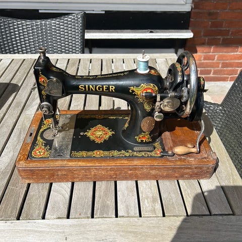 Gammel Singer symaskine med håndsving. Har fine dekorationer på siden.