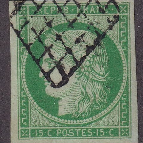 Frankrig; 5c grøn ny med hægte i blok af fire med varianten boule devant le menton, underskrevet Calves, TTB (Yvert nr. 42B); certifikat og ekspertunderskrift inkluderet. Klik på den blå "gå til varen" knap, for at købe eller byde på denne vare. Den samlede pris vil blive vist inden du afgiver dit bud.