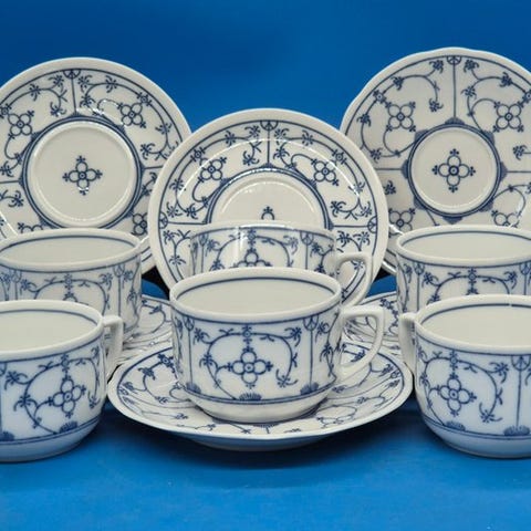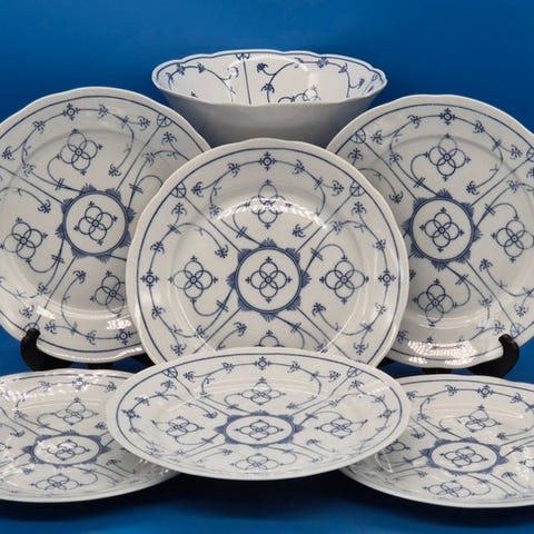 til salg står et klassisk sæt fint porcelæn fra det bayerske værk Winterling Schwarzenbach. Ensemblet imponerer med den tidløse dekor Indisk blå (stråblomstermønster), som gennem generationer står for traditionel tysk bordkultur og overbeviser med sin klare blå underglasurmaleri på hvid baggrund.