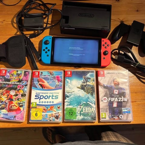 Jeg sælger et komplet Nintendo Switch-sæt bestående af en Switch-konsol (V1-version) sammen med mange spil og tilbehør.