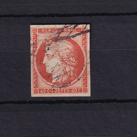 Frankrig, 1. udvalg, bred kant med karminrød nuance Bordeaux 80c, oblitereret, Yvert nr. 49c, fra 1870. Klik på den blå "gå til varen" knap, for at købe eller byde på denne vare. Den samlede pris vil blive vist inden du afgiver dit bud.