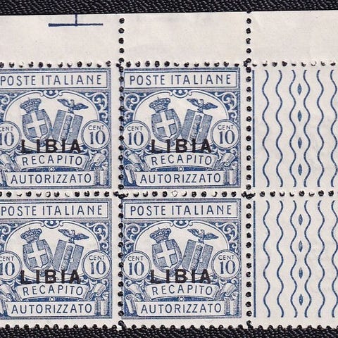 Italiensk Libyen, 1927, Pacchi Postali 10 lire med centralt fas, kvartetten særdeles velcentreret, Sassone 23, Nuovo senza linguella. Klik på den blå "gå til varen" knap, for at købe eller byde på denne vare. Den samlede pris vil blive vist inden du afgiver dit bud.