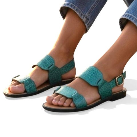 Stilistisk med to bånd, der krydser over og omfavner foden for forsigtigt at støtte hvert skridt.