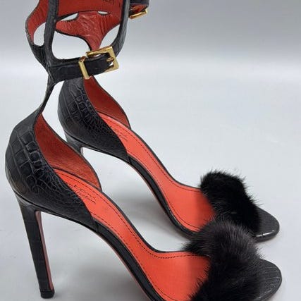 Santoni kvinders guld læder højhælet sandal med abstrakt mønster, lavet i Italien, ny i æske med æske og støvpose; to korsede stropper, mandelformet tå, belagt platformsål og 12 cm blokhøjhæl. Klik på den blå "gå til varen" knap, for at købe eller byde på denne vare. Den samlede pris vil blive vist inden du afgiver dit bud.