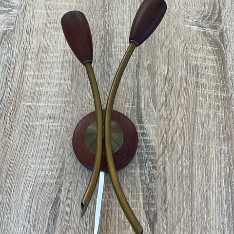 Messingfarvet metalskærm monteret på teaktræ. Afbryder i top. Lampen har drejeled, så belysningen kan indstilles efter ønske. E27 fatning og hvid ledning. Lampen er i fin og original stand.