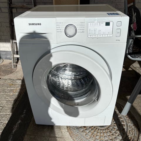 Bosch frontbetjent vaskemaskine i hvid med stort rundt lågeglas. Har drejeknap, display og flere vaskeprogrammer på fronten.