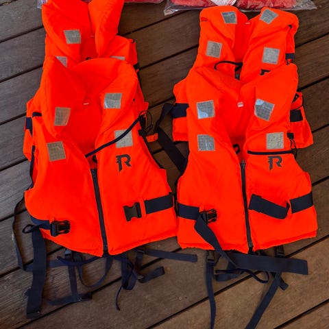 10 til 20 kg. 30 kr stykket Flere orange redningsveste til børn med klikspænder og justerbare stropper. En af dem har mønster med fisk og reflekser foran.