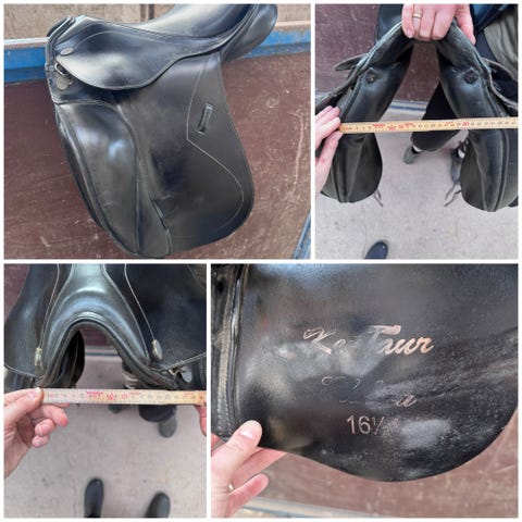 Kieffer norbert koof Exclusive spring sadel i sort, sæde på ca. 16,5". Med knæstøtter og dybt sæde, og der er målt længde på sadlens underside som vist på billederne.