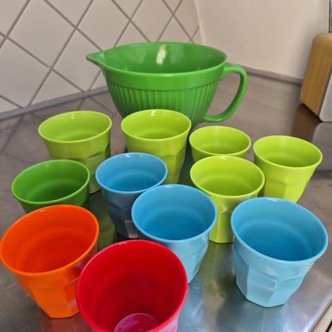 Seks kopper fra Rice. Den med striber og de to med tekst har lidt afslag i toppen. Den blomstrede har en svag revne i bunden, som kun er uden på.
