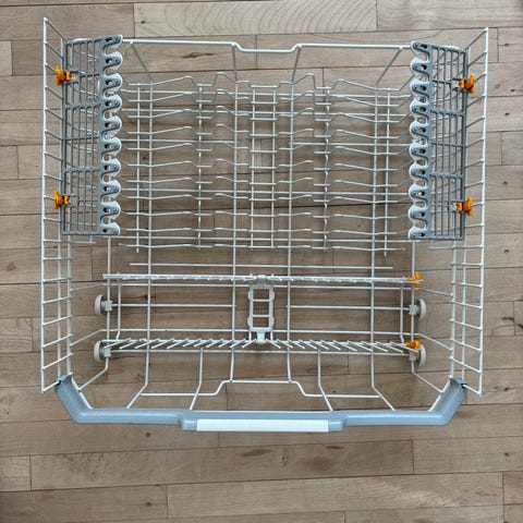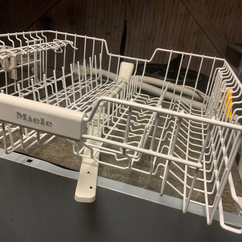 Miele trådkurve over og under. Har justerbare holdere og klapper i kurvene, så tallerkener, glas og bestik kan stå stabilt.