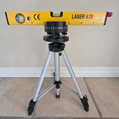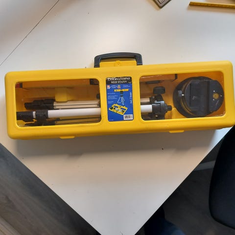 Laser vaterpas med stativ og manual i plastkuffert. Har justerbart stativ og rund drejeskive til nem indstilling af vinkler.