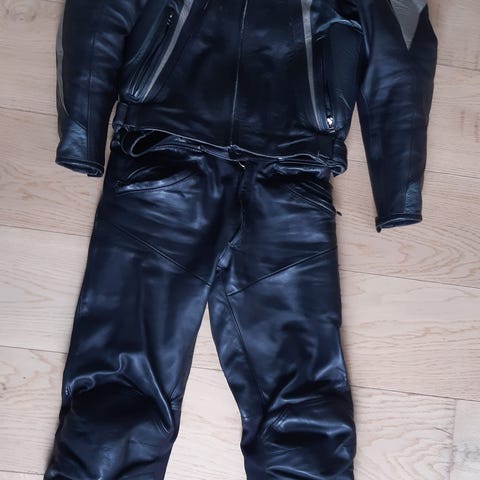 Alletiders Held læder-sæt med rygskjold og div. andre beskyttere. Bukserne (str. 54) har tabt en justeringsstrop som medfølger og kan sættes på igen. Det har dog ikke været en hindring for at bruge bukserne. Jakken er (str. 58) har Helds TFL-cool system med aftageligt inderfor. Til sammenligning har tøjet passet til en person på 192 cm. som bruger str. 34 i alm. jeans.
