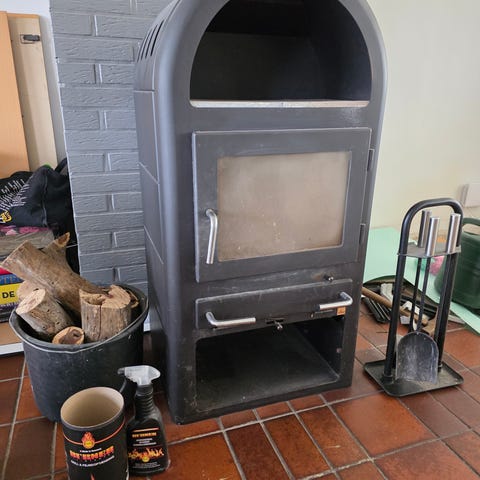 Varde Line 27 brændeovn i grå med stor glaslåge og håndtag i metal. Har askeskuffe, røgafgang bagpå og rum under ovnen til opbevaring af brænde. Den skal ikke udskiftes ved salg af bolig. Virker godt. Mangler skamolsæt da den gik stykker under flytning