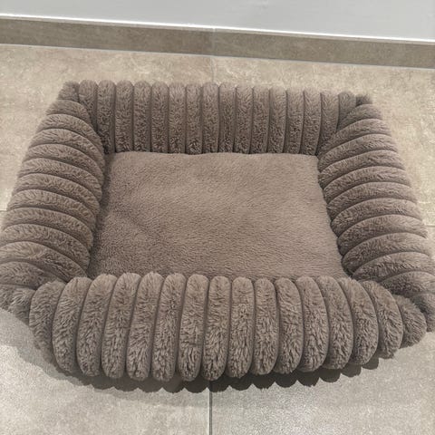Lækker teddy hundeseng i beige med høje kanter og blød pude i bunden. Har skridsikker bund, så den ligger fast på gulvet. Aldrig blevet brugt. Mål står på sidste billede. Befinder sig i Islev/rødovre.