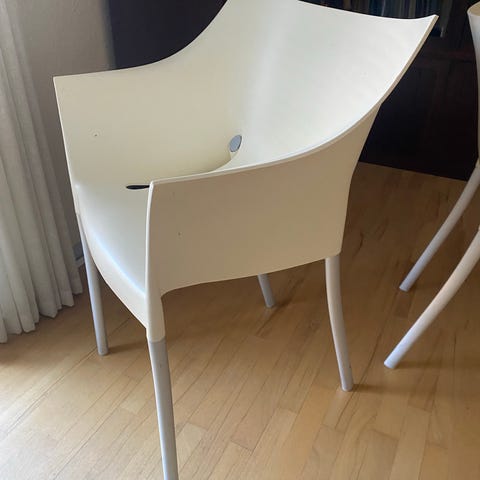 Bordet fremstår i meget velholdt stand med minimal brugsslitage. Det elegante design med hvid, blank bordplade og krom understel giver et moderne og eksklusivt udtryk, der passer perfekt ind i de fleste hjem.