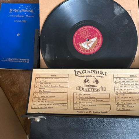 Linguaphone, engelsk kursus, 15 plader i lille kuffert, alder kendes ikke 75 kr.