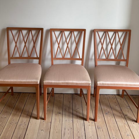 Der er silkestof på sæderne i sart lyserød. Alle sæder har pletter og skjolder på stoffet, er ikke forsøgt fjernet.