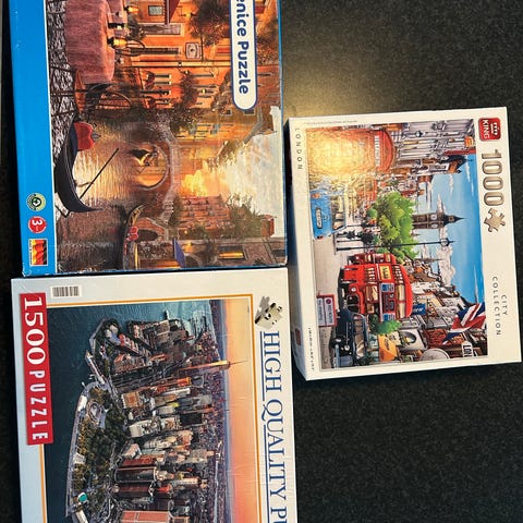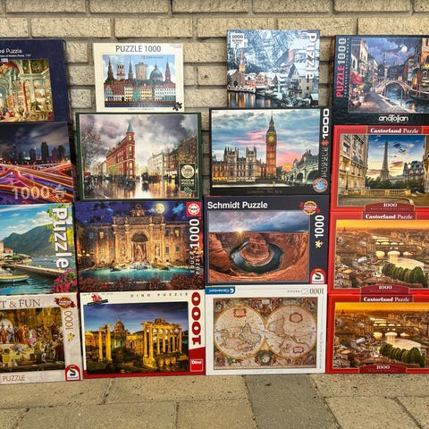 Samlet pakke med 6 puslespil: 5 med 1000 brikker og 1 med 4x500 brikker, bl.a. motiver fra København, Paris, New York og impressionisme.