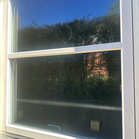 Hvide vinduer med sort plissegardin i rammen