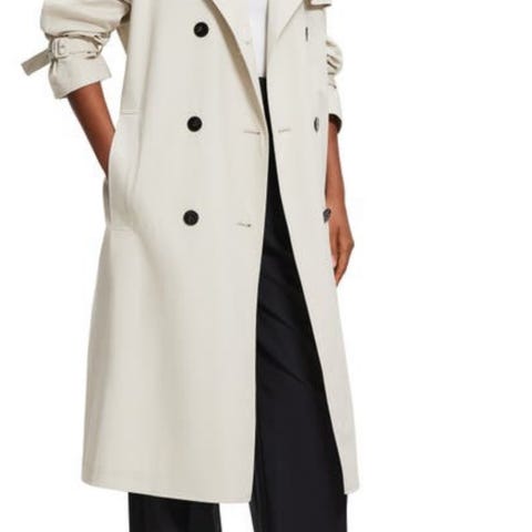 Beige frakke fra Betty Barclay i polyester, str 42, med dobbeltknaplukning og bindebælte i taljen. Har sidelommer og detalje på ryggen med ekstra læg for bedre pasform.