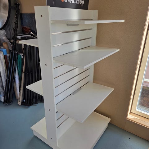 Praktisk reol i lyst træ med hjul. God opbevaringsplads med hylder og låger. Nem at flytte og velegnet til kontor eller hjem. Fremstår pæn og velholdt.