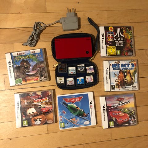Nintendo DSi XL i sort med stor skærm og indbygget kamera. Flere børnespil medfølger, samt taske og oplader som på billederne. Original kasse medfølger også