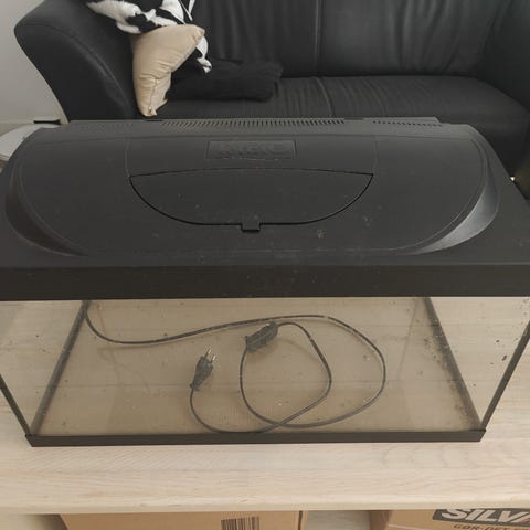 Akvarium på stativ med grus, dekorationer og termometer i tanken. Medfølgende ses bl.a. vandplejemidler fra Tetra og fiskefoder fra MultiFit på hylden under.