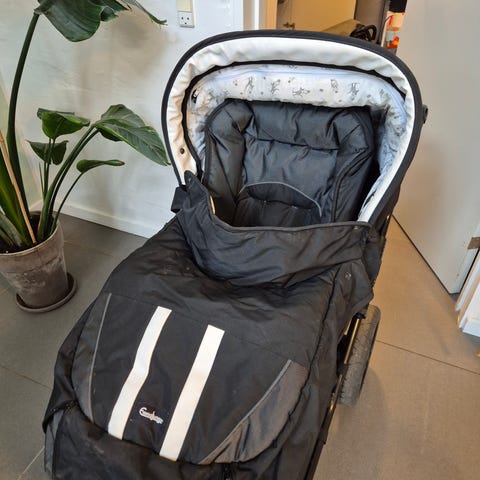 Emmaljunga Viking klapvogn i grå med justerbart håndtag. Har drejehjul foran og stor kaleche til barnet.