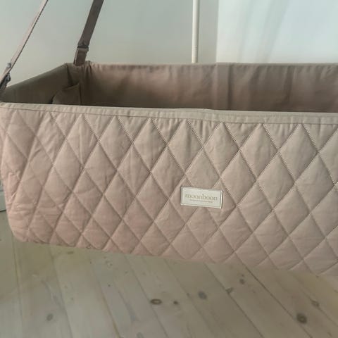 Moonboon vugge i beige med alt tilbehør, som vist på billederne. Kun brugt få gange og fremstår som ny.