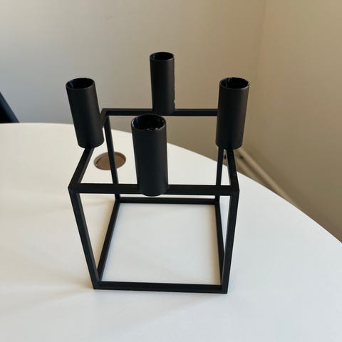 by Lassen Kubus lysestage til 4 lys i sort metal. Står stabilt på bordet og har fire rørformede holdere til stearinlys.