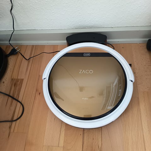 Eufy RoboVac 11S robotstøvsuger i hvid med lav profil, der nemt kører under møbler. Har to sidebørster under bunden og styres via den medfølgende fjernbetjening og ladestation. Virker upåklageligt.