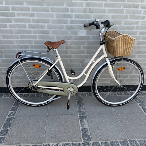 Batavus damecykel med 28" hjul i sort, brun sadel og håndtag. Fastmonteret cykelkurv foran, bagagebærer og støtteben.