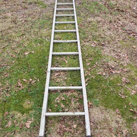 Alu stige 4 m . Bund 47 cm top 36 cm 14 trin. God til arbejde ved tag og facade. Let at flytte rundt på og nem at stille op mod væg eller bygning.